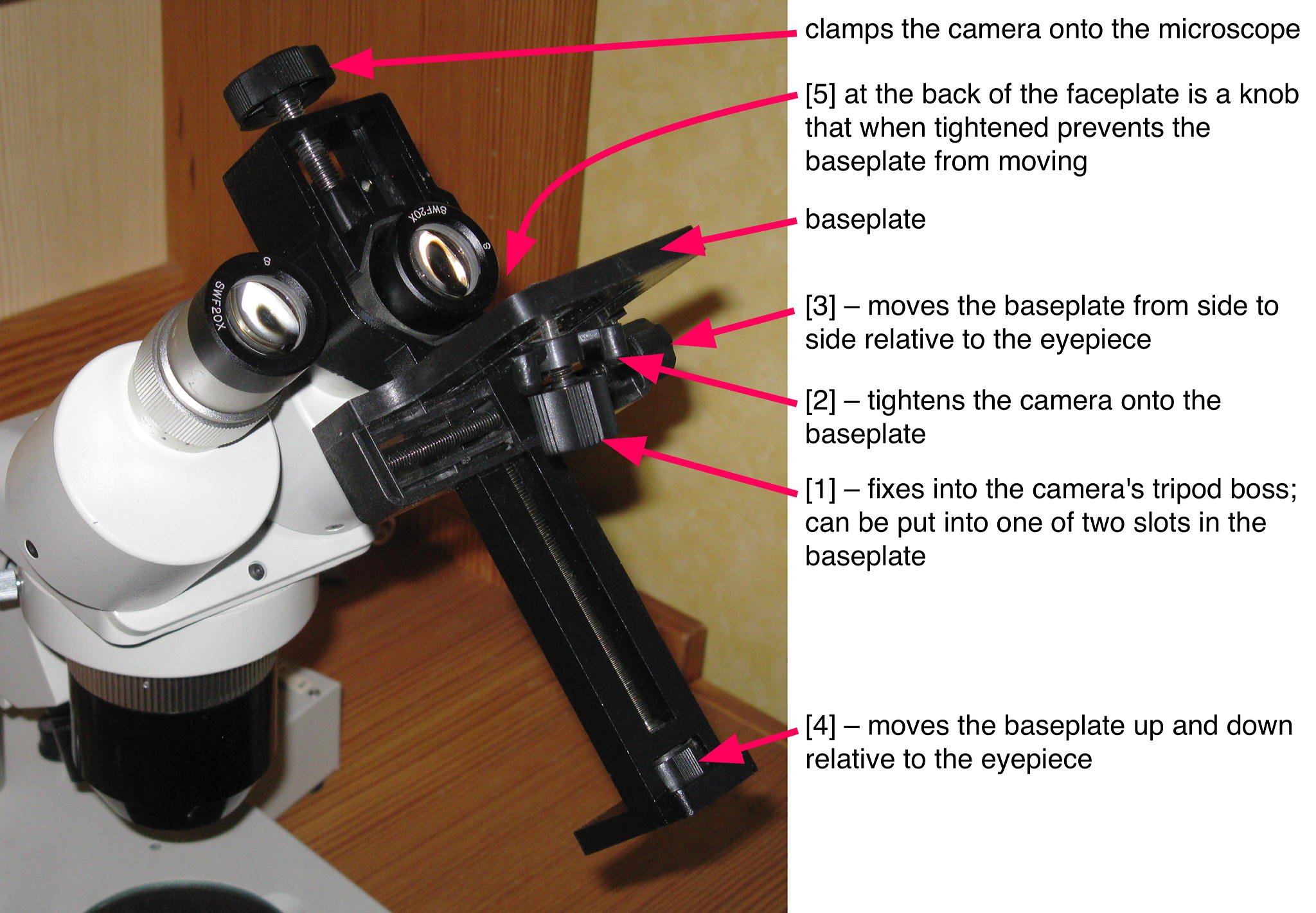 Before you attempt to fix the bracket to the microscope, ensure that [5] at the back of the baseplate is loose. Choose the right slot on the baseplate for your camera in order that the lens is as central as possible – my camera has the tripod mount to the left, so it fits on the left-hand slot. Turn [2] away from the baseplate. Tighten [1] cautiously. Make sure the camera is parallel to the edge of the plate. Tighten [2]. Now use [3] and [4] to position the camera lens in line with the clamp. Then loosen the camera from the baseplate, make sure the lens is fully extended, and clamp the bracket to the microscope, ensuring that the lens is flat against the eyepiece and more-or-less in line (adjusting via [3] and [4]). Tighten [2] again.
